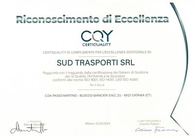 Every year Sud Trasporti renews its UNI EN ISO 9001 certification.